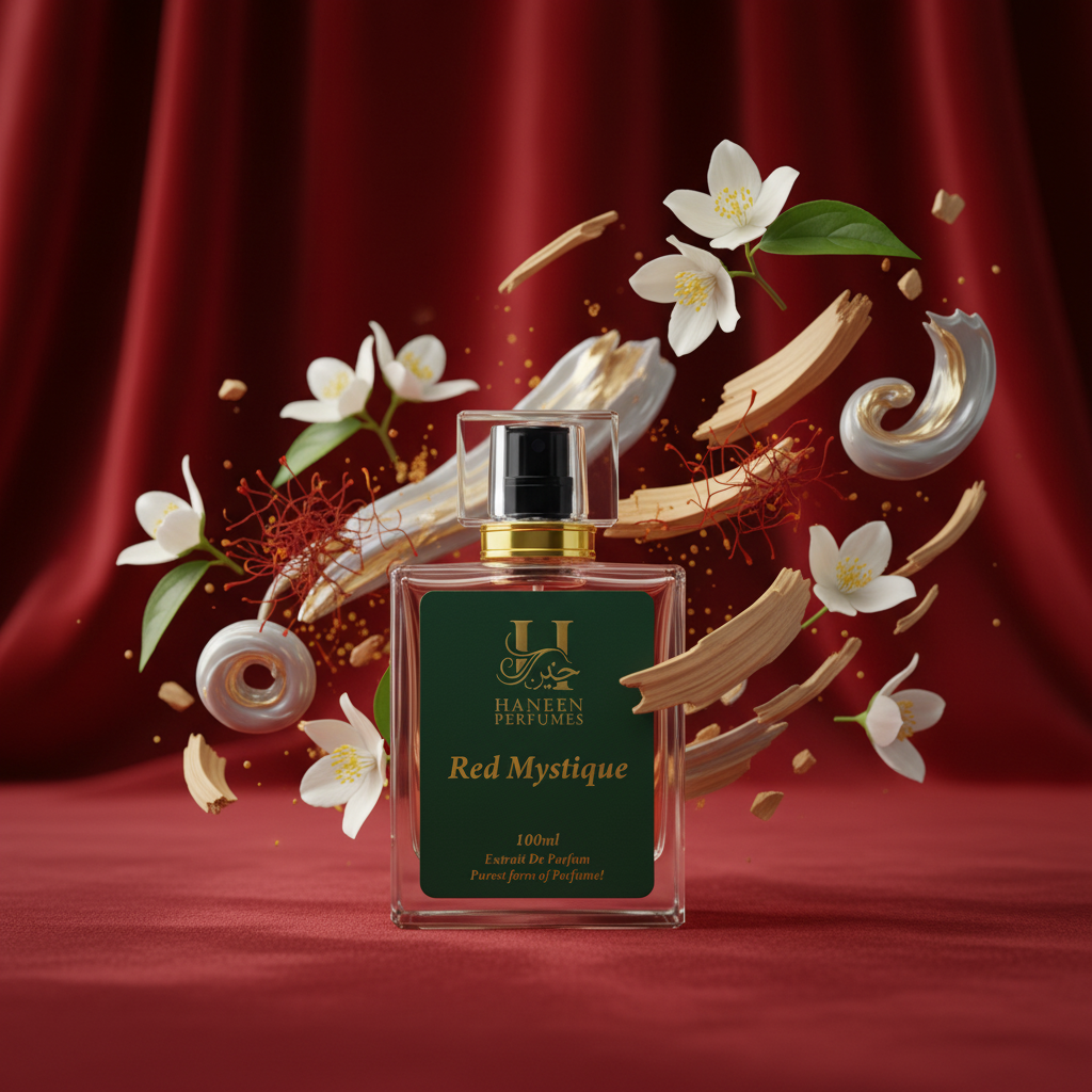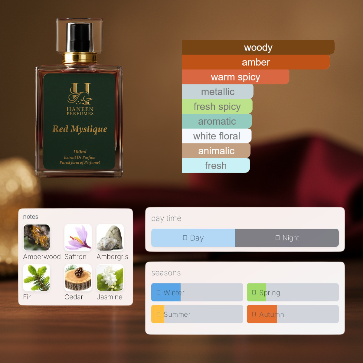 Red Mystique opens with a glowing duo of saffron and jasmine, creating a rich floral-spice bloom that feels both exotic and elegantly feminine. As it settles, a warm heart of amberwood, ambergris, and hedione reveals itself smooth, radiant, and addictive, adding a captivating depth that feels like liquid gold on the skin.